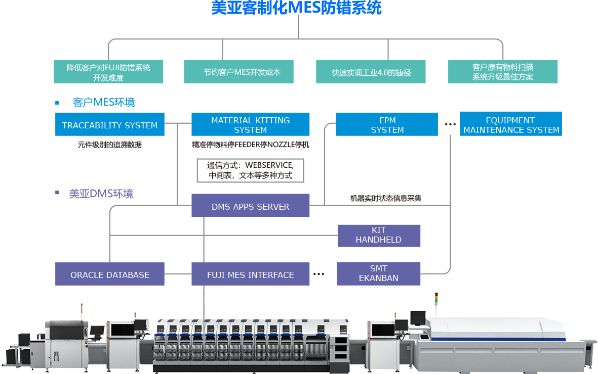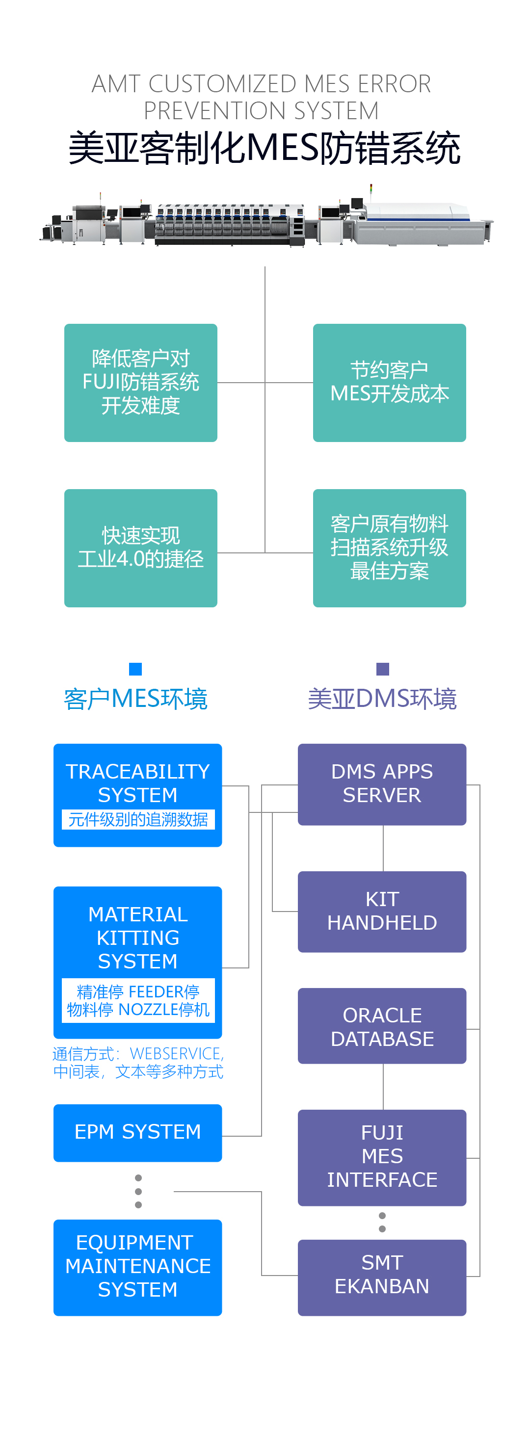 FUJI的機器很先進,它的接口開發(fā)需要開發(fā)者有很專業(yè)的FUJI設備經(jīng)驗,為加快客戶的工業(yè)4.0的實施進度,美亞根據(jù)自己實力應勢推出客制化MES防錯系統(tǒng)。